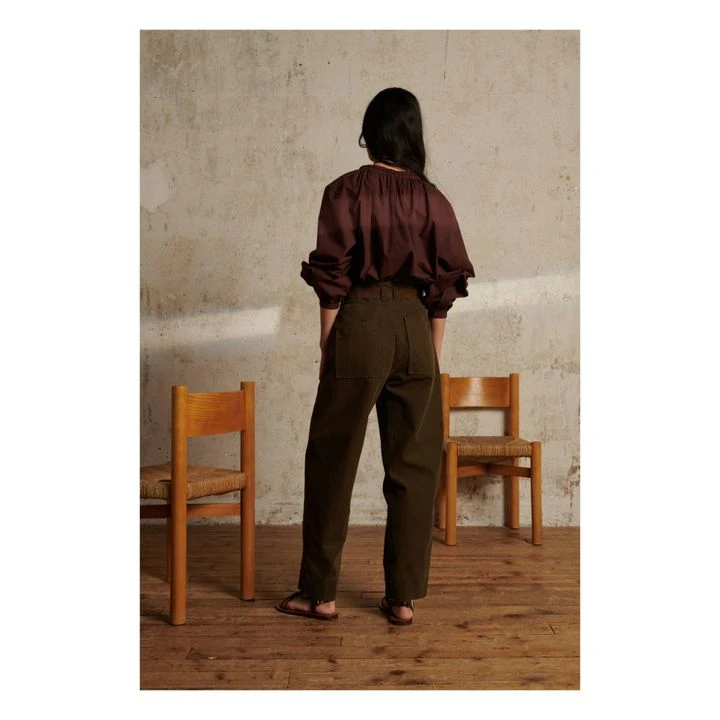 - Tightened at the wrists, Gathered neckline, V neck, Slit, Tie(s) at neckline, Puff sleeves, Long sleeves